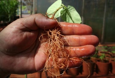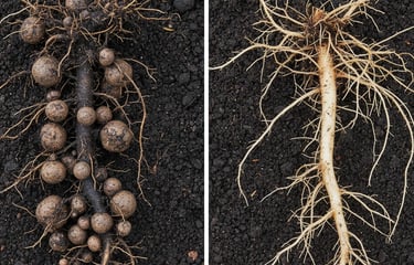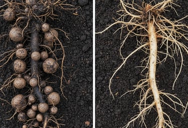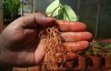 Os nematoides são organismos microscópicos presentes no solo que atacam principalmente o sistema radicular das plantas. Ao se alimentarem das raízes, comprometem a absorção de água e nutrientes, prejudicando o desenvolvimento da cultura e reduzindo a produtividade.